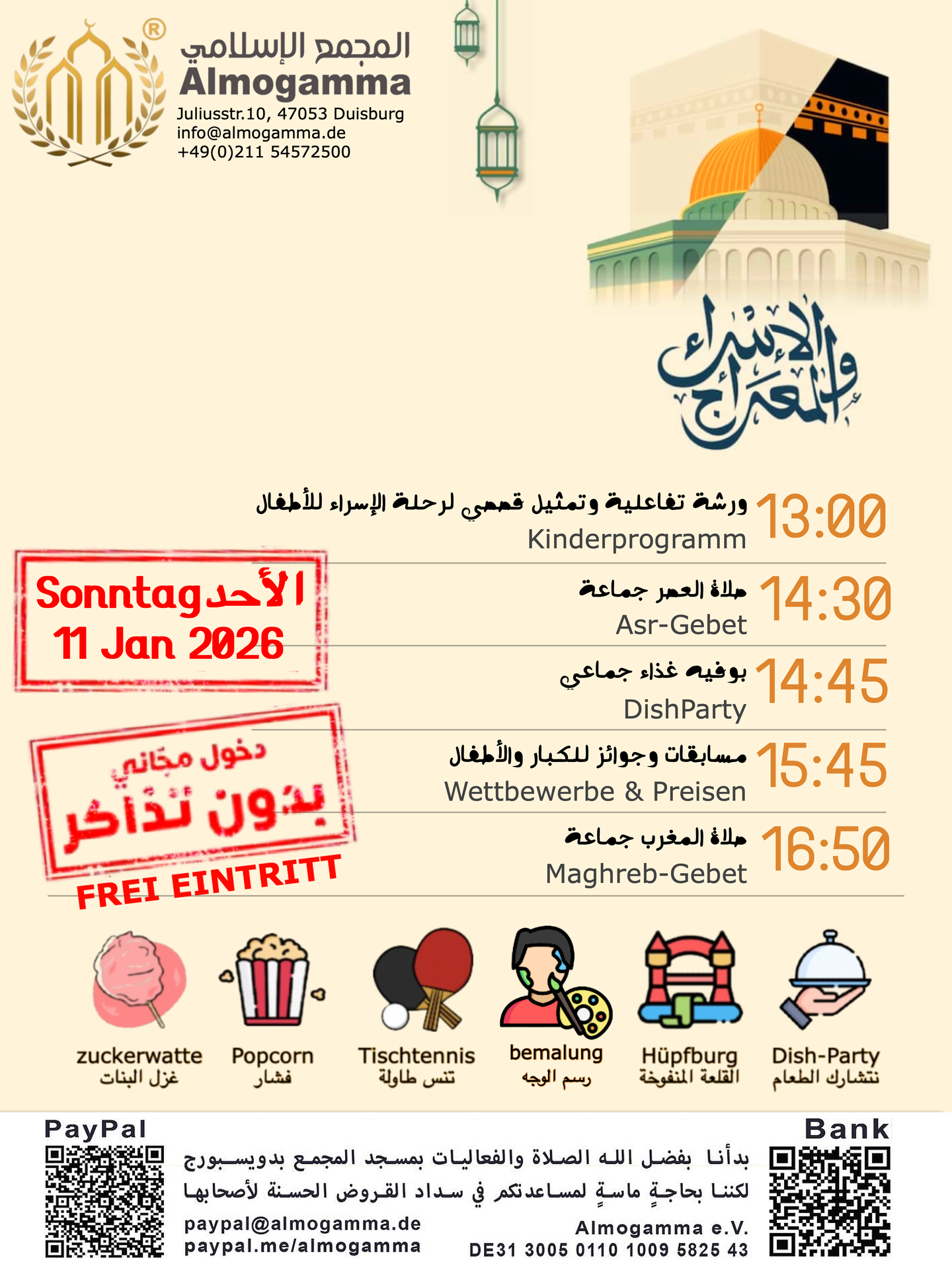 الحفل مجاني ومتاح للجميع، ولكن نحتاج تبرعاتكم لسداد دين المسجد والاستمرار في الأنشطة والمشاريع التي تخدم المسلمين
