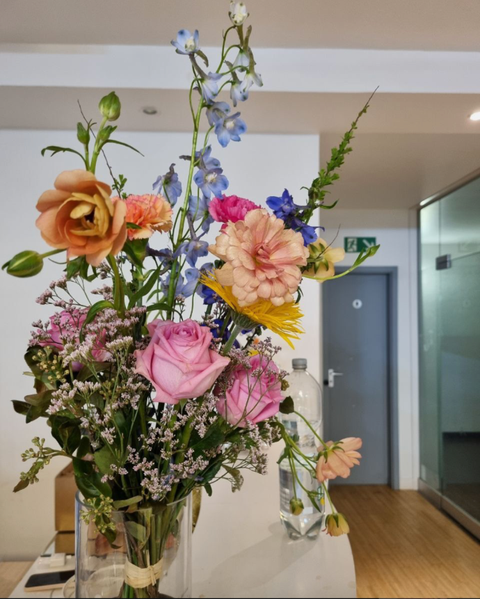 تلبيةً لدعوتنا شاركتنا مجموعة من خمسة ألمان إفطار أمس، إحداهما سيدة مسنة.. وقد سعدنا جدًا بوجوهم لأكثر من سبب.. فقد أحضروا باقةً من الزهور معهم كما في الصورة، وجميعهم كان يتعلم قبل الإفطار بعض الكلمات العربية (مثل شكرًا) وما إلى ذلك، وتبادلوها معنا بلطفٍ شديدٍ.. كما أن السيدة اللطيفة أحضرت معها غطاءً للرأس، احترامًا منها لمن تزورهم، بل وتركت الرجال في مجموعتها لتجلس مع النساء في الإفطار.